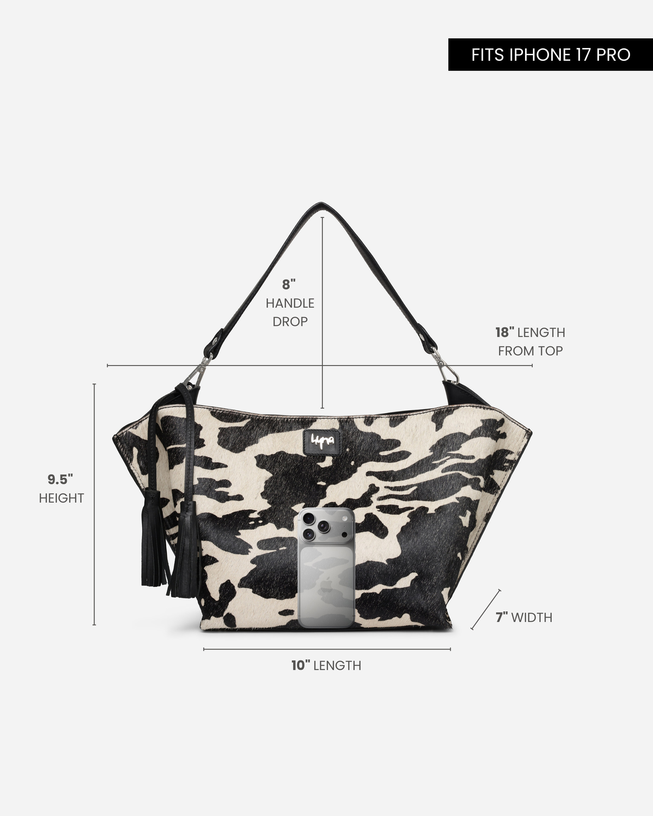 The Hyna Iconic Opal Tassel Handbag is crafted from premium soft calfskin leather, blending timeless craftsmanship with modern elegance. The 100% natural cowhide panel features expertly polished hair-on-hide, tinted to achieve a refined contrast of black and white for a sophisticated look.