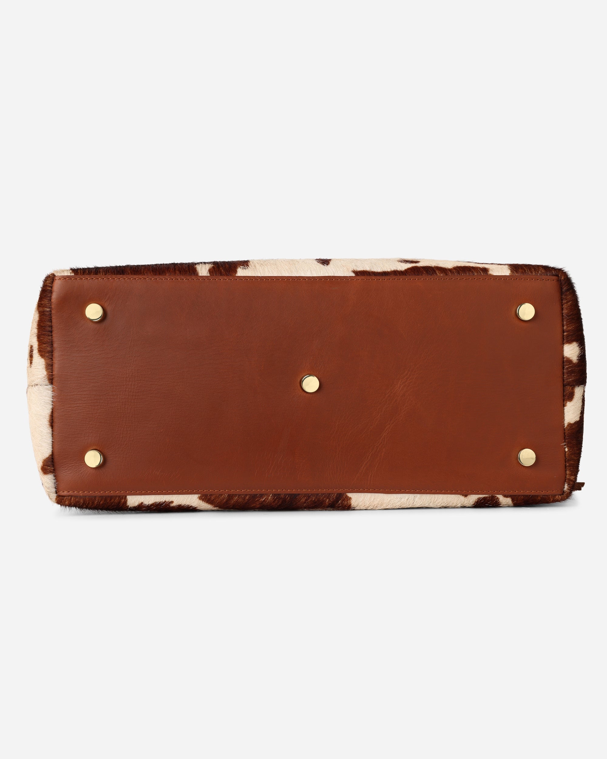 The Hyna Classic Tote is crafted from rich calf leather and 100% natural cowhide, perfectly dyed in a harmonious tan and white balanced, bold, and beautifully untamed. No two bags are alike, just like the life you carry with you.