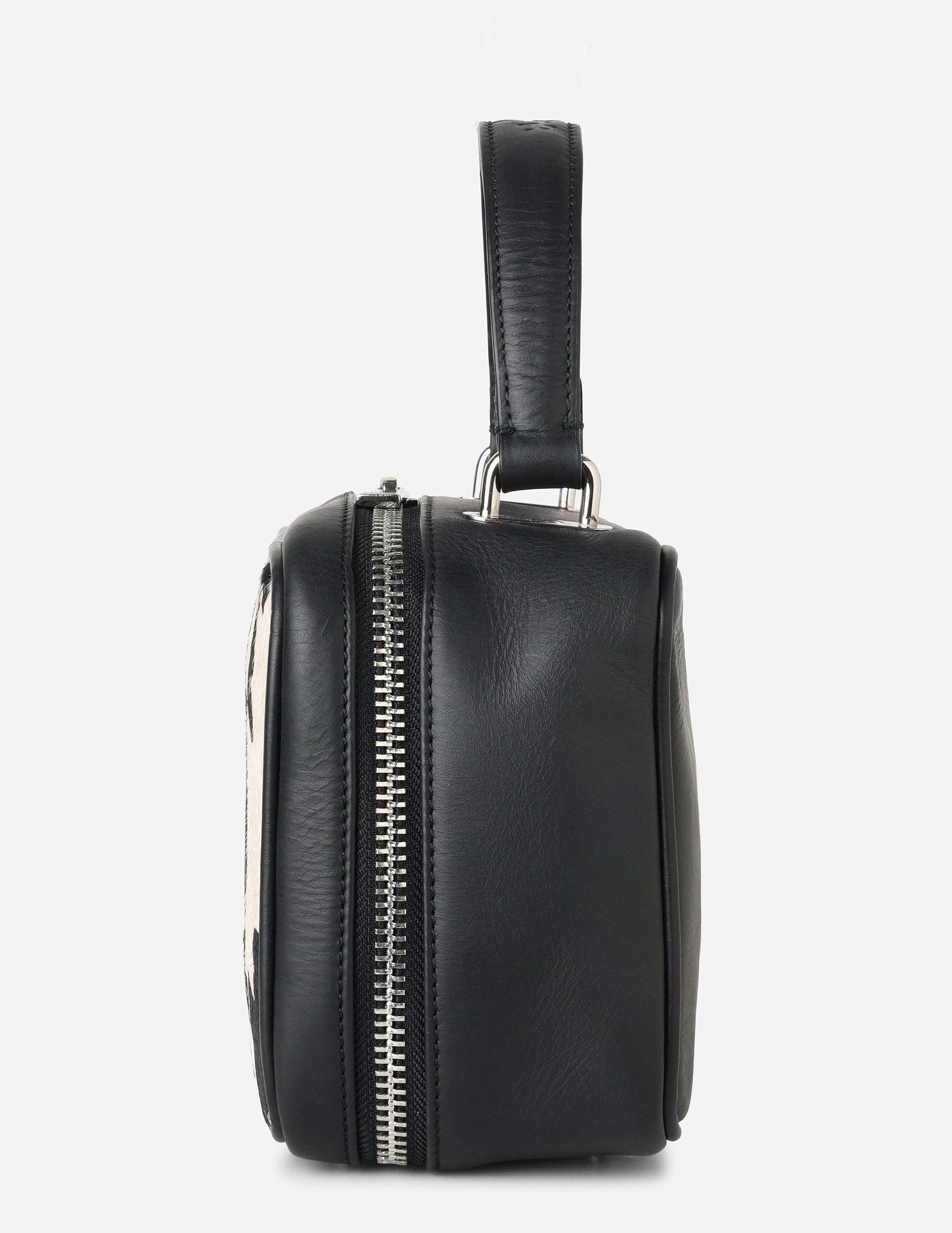 The exterior showcases a bold hand-dyed cowhide body, offering a striking, consistent black and white pattern that pairs perfectly with the oversized, stitched leather Hyna logo.