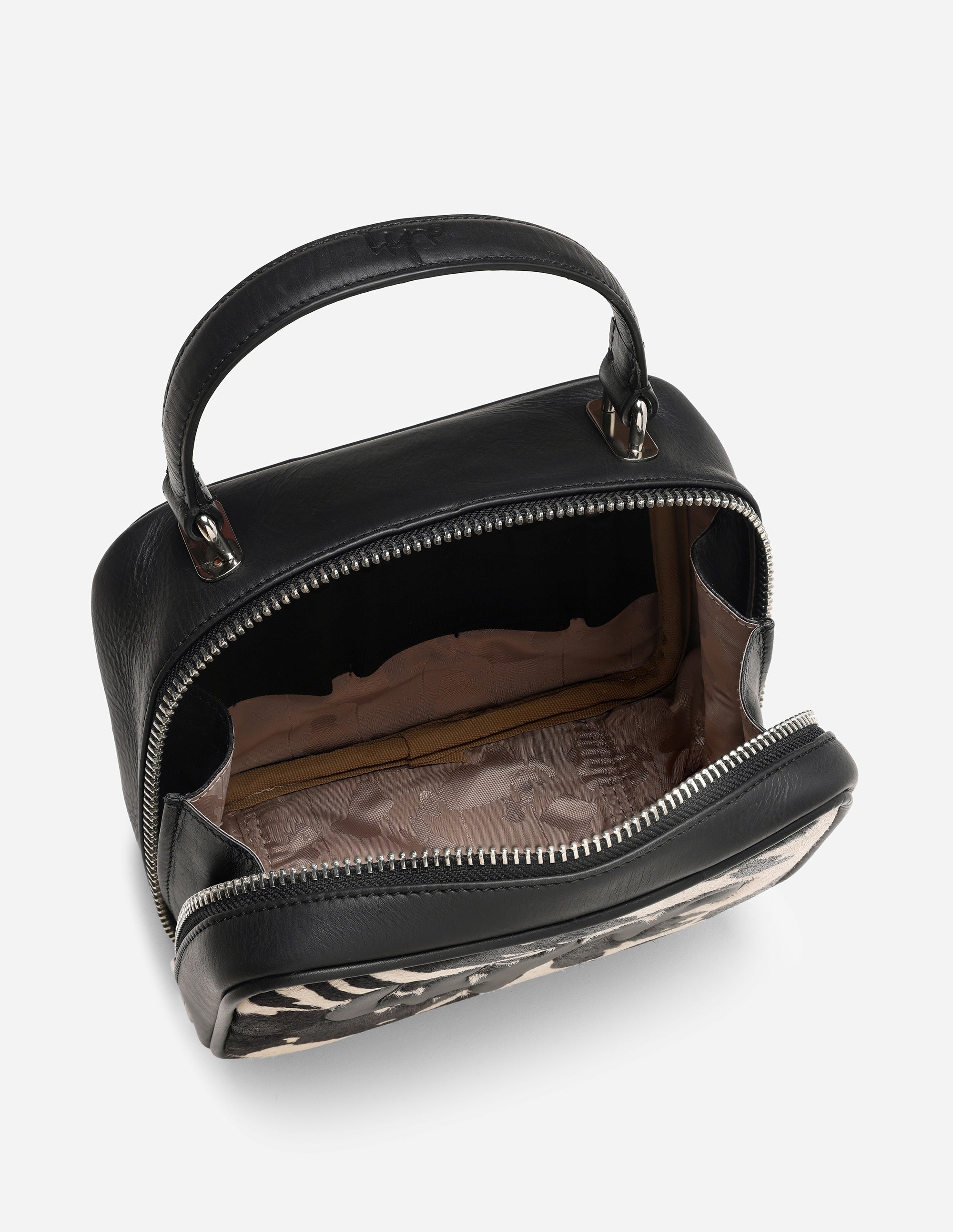 Elevate your beauty routine with the Hyna Cowgirl Glam Box in Hand-Dyed Black & White natural hair-on-hide. This functional vanity case is designed for the woman who demands elegance in every aspect of her life.