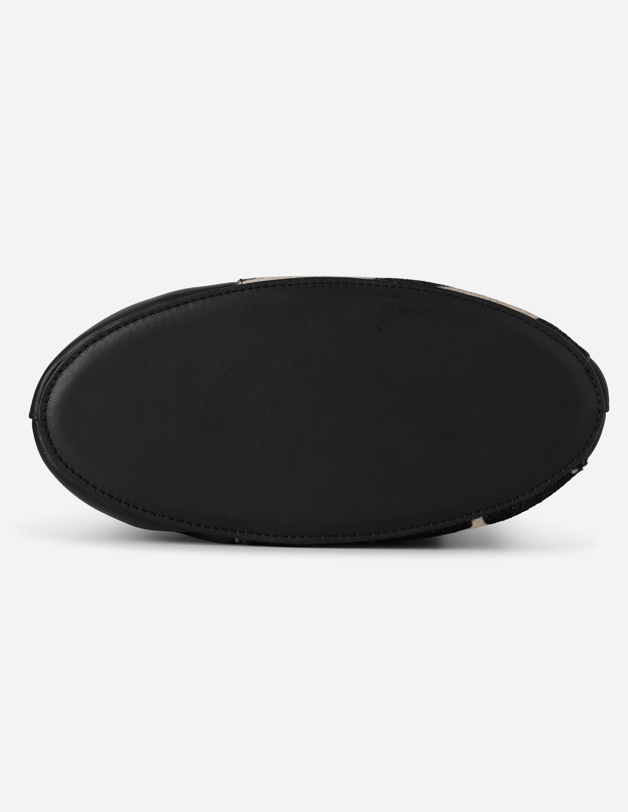 The body is crafted from smooth, premium full-grain leather, acting as a canvas for the hand-dyed cowhide circles. This specialized dyeing process guarantees a high-contrast, uniform black and white finish that looks polished and editorial.