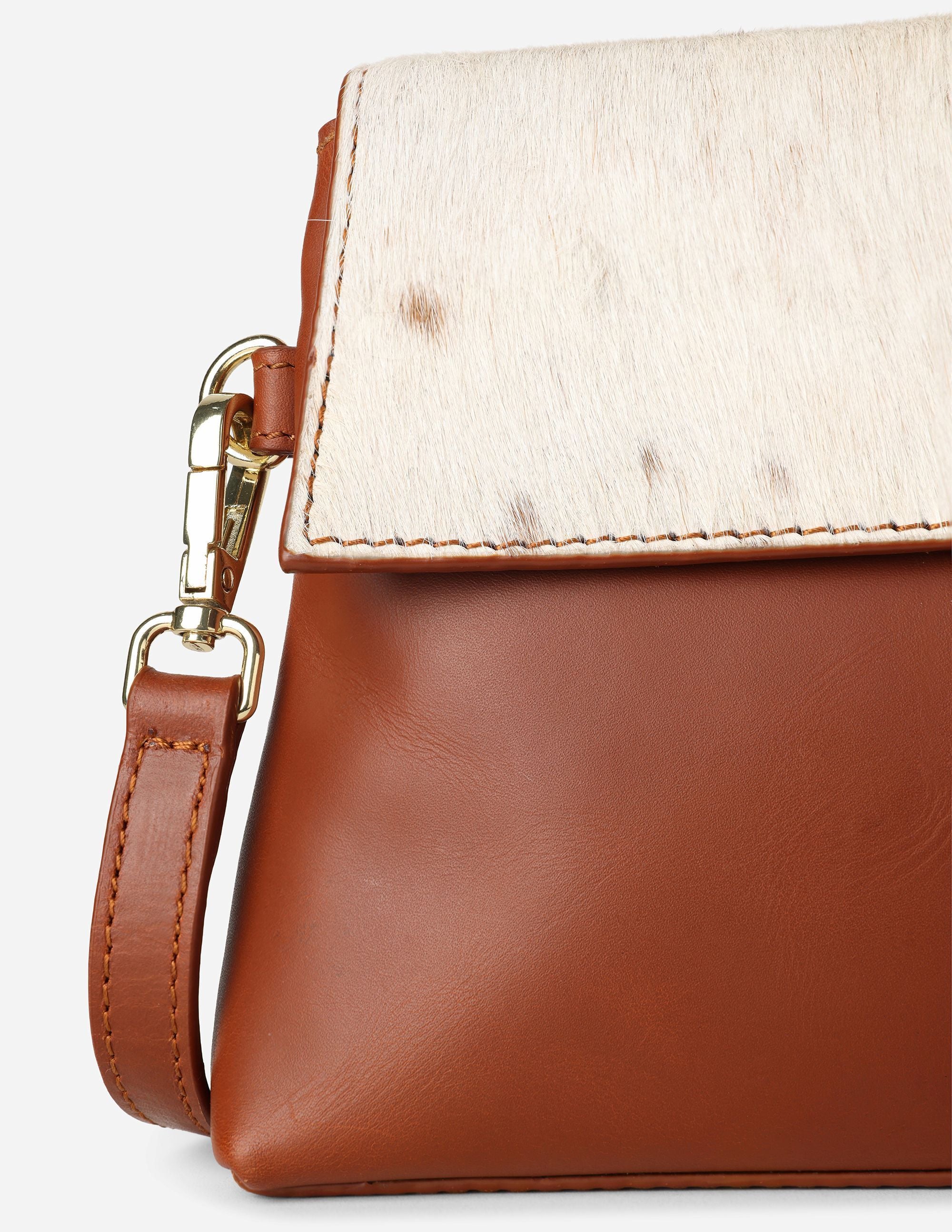 The focal point is the 100% natural cowhide flap. Because we leave the hide in its natural state, the tan and white pattern varies from bag to bag, ensuring you own a unique work of art that cannot be replicated.